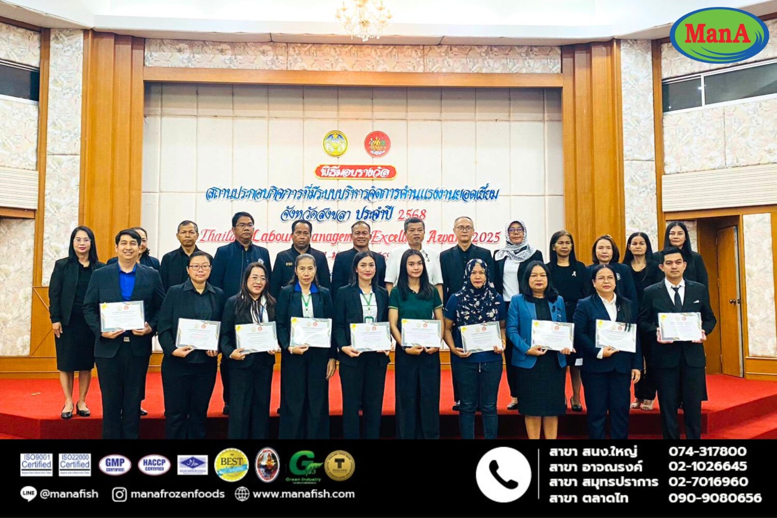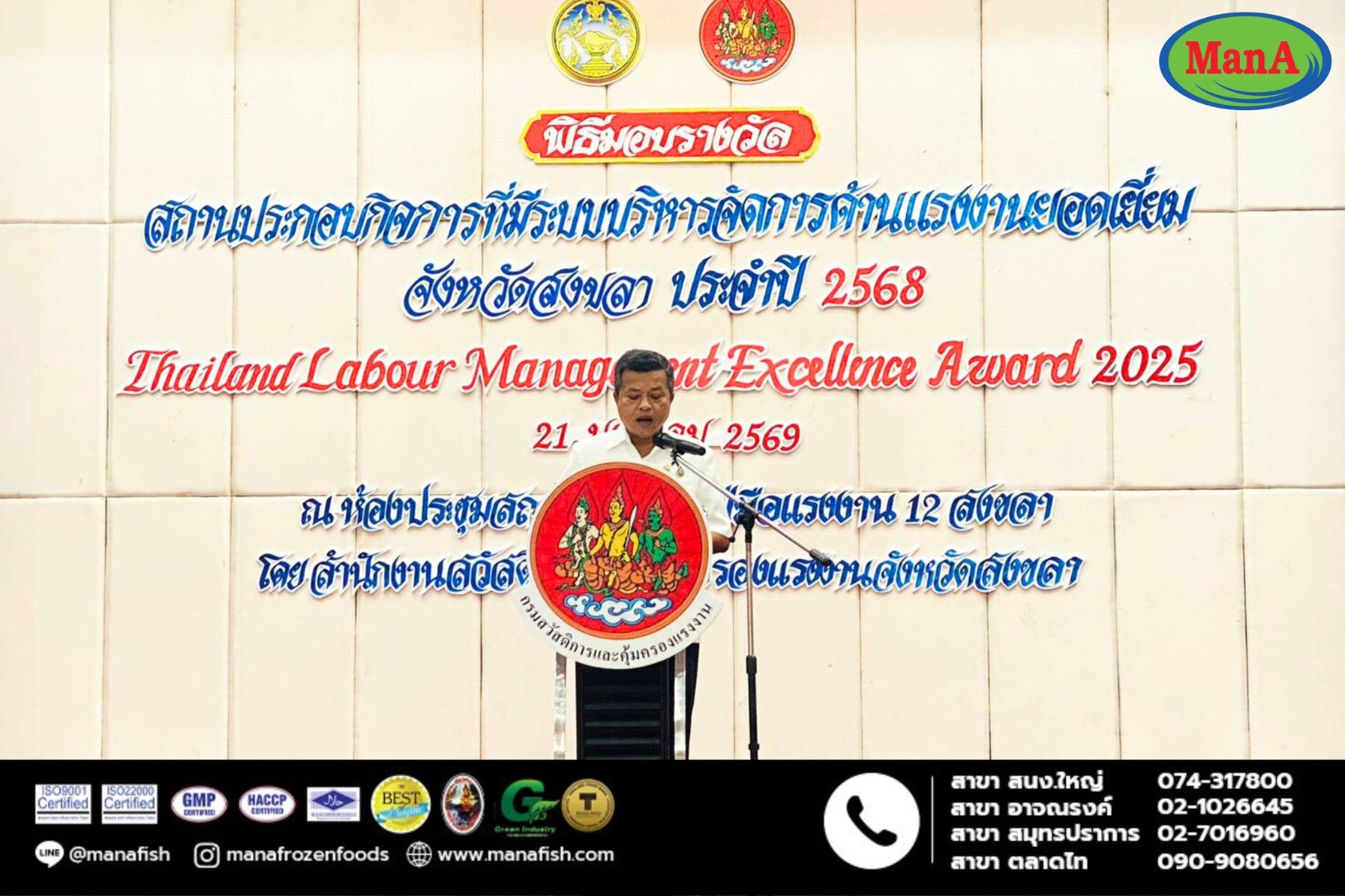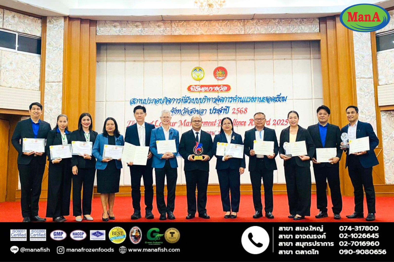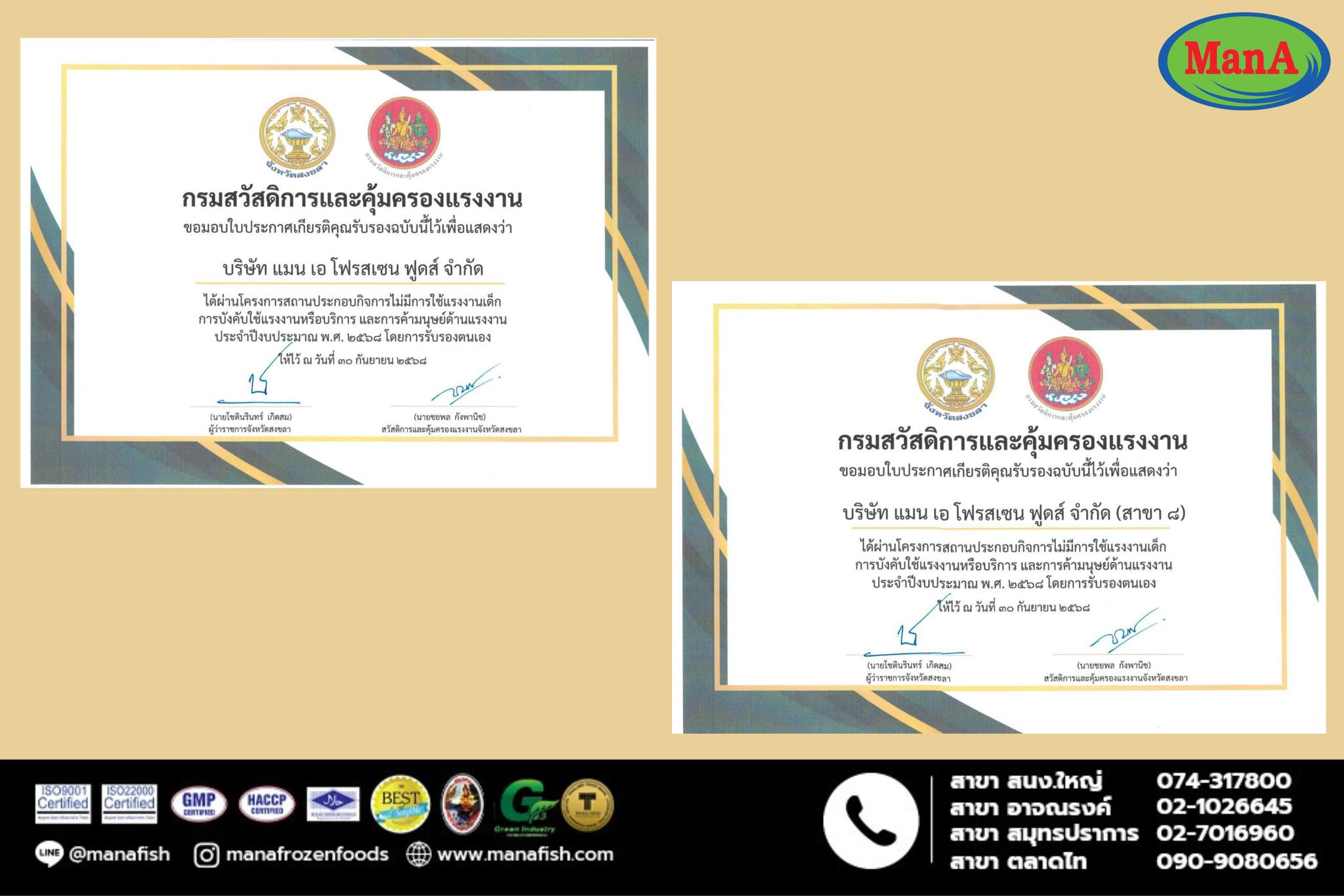 บริษัท แมนเอโฟรสเซนฟูดส์ จำกัดได้รับรางวัลประกาศเกียรติคุณสถานประกอบกิจการปลอดการบังคับใช้แรงงานภายใต้โครงการ ไม่มีการใช้แรงงานเด็ก การบังคับใช้แรงงานหรือบริการ และการค้ามนุษย์ด้านแรงงานโดยได้รับเกียรติจาก นายรัฐศาสตร์ ชิดชู ผู้ว่าราชการจังหวัดสงขลา เป็นประธานมอบรางวัลเนื่องใน พิธีมอบรางวัลสถานประกอบกิจการที่มีระบบบริหารจัดการด้านแรงงานยอดเยี่ยม จังหวัดสงขลา ประจำปี 2568 ณ ห้องประชุม สถาบันพัฒนาฝีมือแรงาน 12 สงขลา ตำบลเขารูปช้าง อำเภอเมืองสงขลา จังหวัดสงขลา บริษัทฯมุ่งมั่นในการดำเนินธุรกิจอย่างมีความรับผิดชอบ เคารพสิทธิมนุษยชน และยึดหลักการจ้างงานที่เป็นธรรมและยั่งยืน#บริษัทแมนเอโฟรเซนฟูดส์#ลูกชิ้นปลาแมนเอ#ของดีเมืองสงขลา